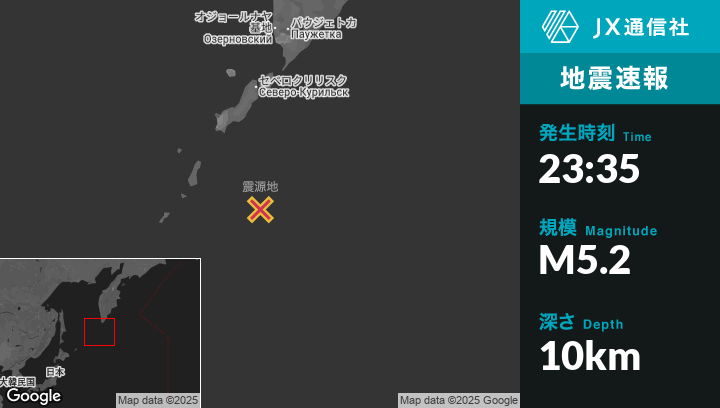 7月30日 23:35頃、ロシアのSevero-Kuril’skから南184kmの地点でM5.2の地震がありました。