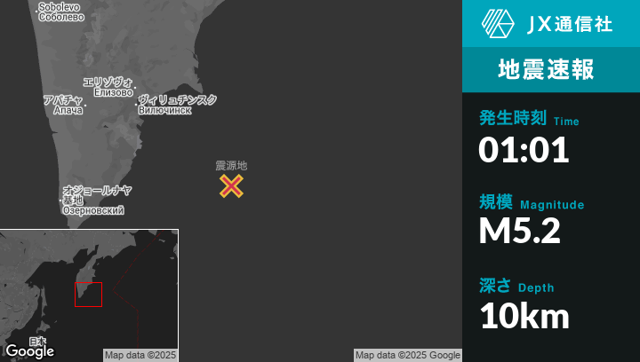 7月31日 01:01頃、ロシアのPetropavlovsk-Kamchatskyから南東202kmの地点でM5.2の地震がありました。