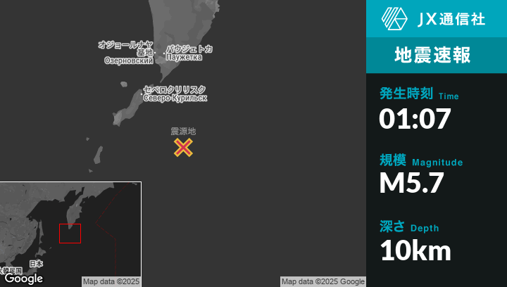 | 震源地 | ロシアのSevero-Kuril’skから南東144kmの地点 |