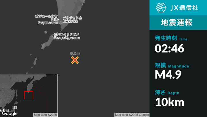 | 震源地 | ロシアのSevero-Kuril’skから南東170kmの地点 |