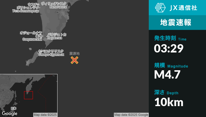 7月31日 03:29頃、ロシアのSevero-Kuril’skから東202kmの地点でM4.7の地震がありました。