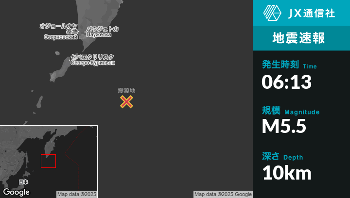 7月31日 06:13頃、ロシアのSevero-Kuril’skから南東222kmの地点でM5.5の地震がありました。