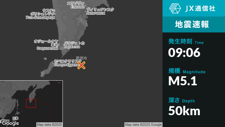 | 震源地 | ロシアのSevero-Kuril’skから東138kmの地点 |