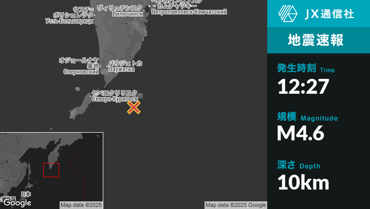 | 震源地 | ロシアのSevero-Kuril’skから東南東132kmの地点 |