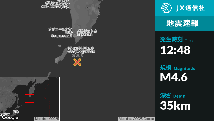 7月31日 12:48頃、ロシアのSevero-Kuril’skから南東77kmの地点でM4.6の地震がありました。