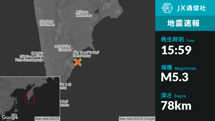 7月31日 15:59頃、ロシアのVilyuchinskから南東42kmの地点でM5.3の地震がありました。