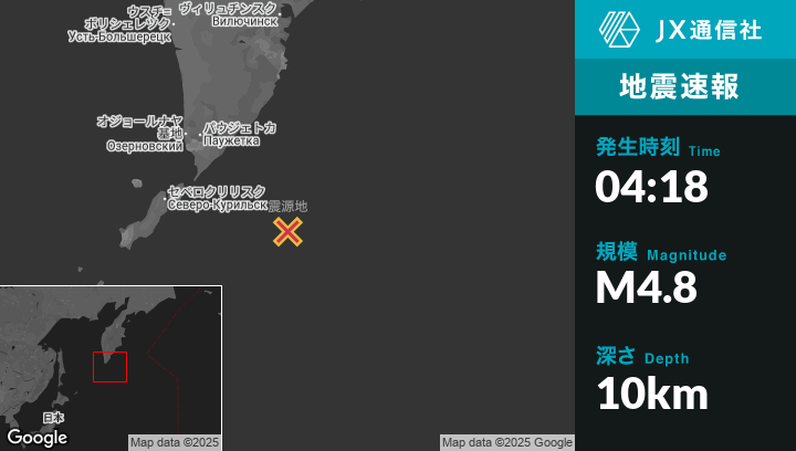 8月01日 04:18頃、ロシアのSevero-Kuril’skから東南東176kmの地点でM4.8の地震がありました。