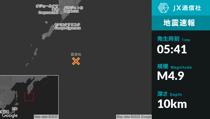 | 震源地 | ロシアのSevero-Kuril’skから南南東214kmの地点 |