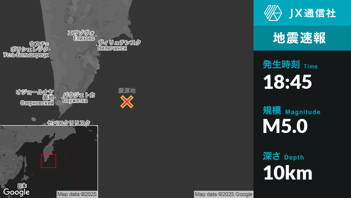 8月01日 18:45頃、ロシアのVilyuchinskから南南東190kmの地点でM5.0の地震がありました。