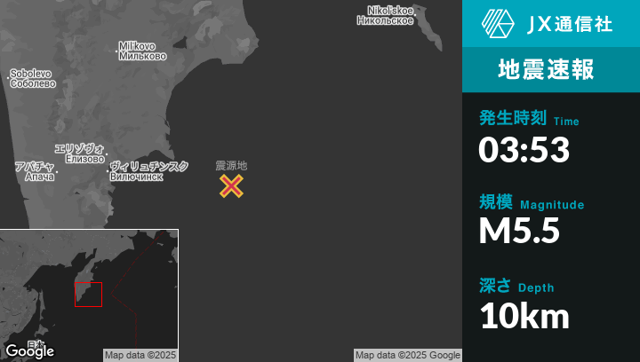 8月02日 03:53頃、ロシアのPetropavlovsk-Kamchatskyから東192kmの地点でM5.5の地震がありました。