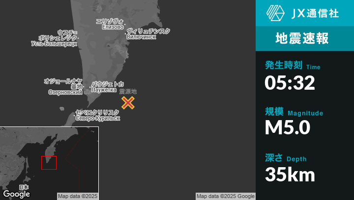 | 震源地 | ロシアのOzernovskiyから東南東147kmの地点 |