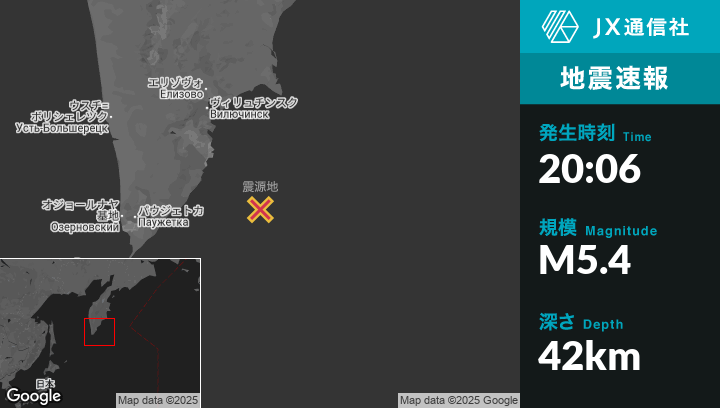 8月02日 20:06頃、ロシアのVilyuchinskから南南東163kmの地点でM5.4の地震がありました。