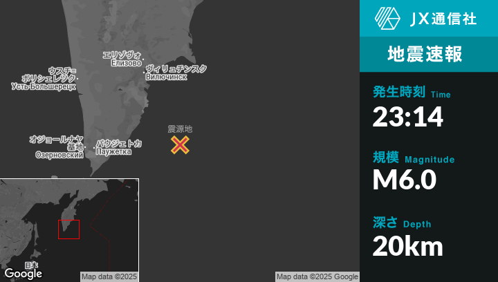 8月02日 23:14頃、ロシアのVilyuchinskから南南東166kmの地点でM6.0の地震がありました。