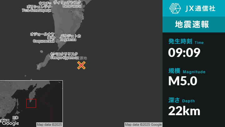8月03日 09:09頃、ロシアのSevero-Kuril’skから東南東162kmの地点でM5.0の地震がありました。