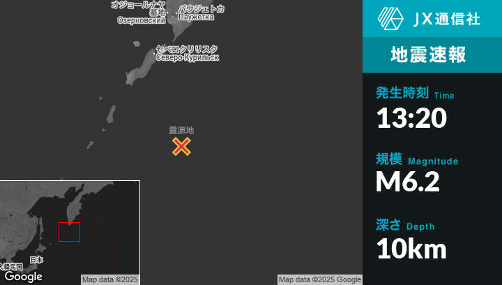 | 震源地 | ロシアのSevero-Kuril’skから南南東210kmの地点 |
