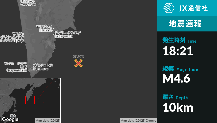 8月04日 18:21頃、ロシアのVilyuchinskから南東181kmの地点でM4.6の地震がありました。