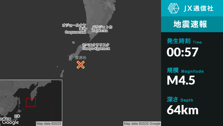 8月05日 00:57頃、ロシアのSevero-Kuril’skから南81kmの地点でM4.5の地震がありました。
