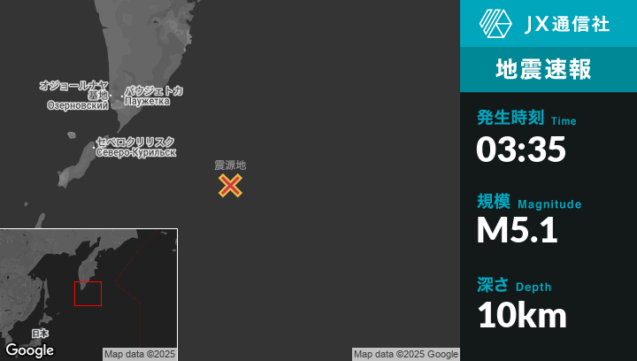 8月08日 03:35頃、ロシアのSevero-Kuril’skから東南東246kmの地点でM5.1の地震がありました。