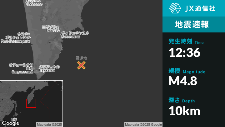 8月09日 12:36頃、ロシアのVilyuchinskから南東169kmの地点でM4.8の地震がありました。