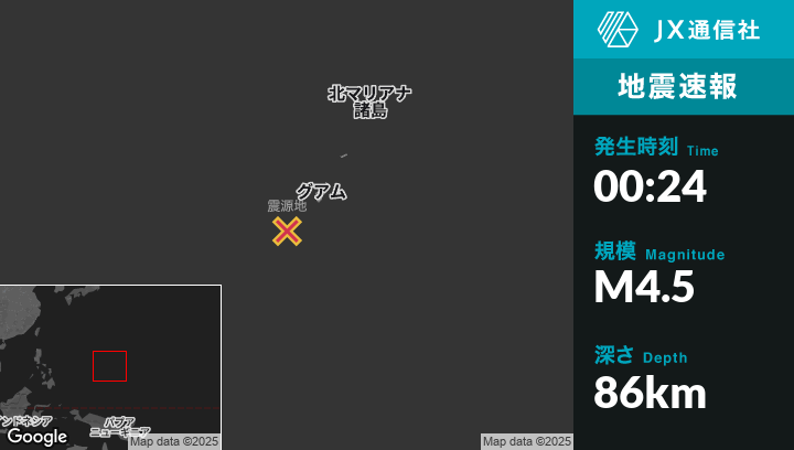 8月11日 00:24頃、グアムのMerizo Villageから南西82kmの地点でM4.5の地震がありました。