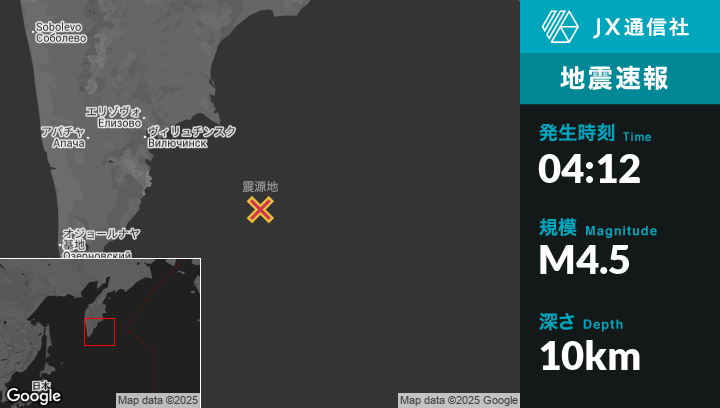 8月11日 04:12頃、ロシアのPetropavlovsk-Kamchatskyから南東193kmの地点でM4.5の地震がありました。