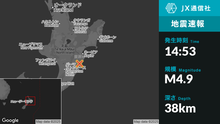 | 震源地 | ニュージーランドのRaurekaから南南西35kmの地点 |