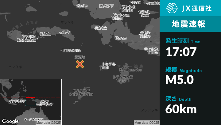 | 震源地 | インドネシアのTualから西168kmの地点 |
