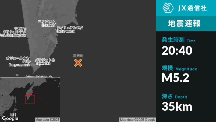 8月13日 20:40頃、ロシアのVilyuchinskから南東193kmの地点でM5.2の地震がありました。