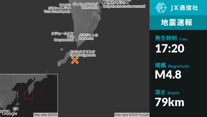 8月16日 17:20頃、ロシアのSevero-Kuril’skから南東41kmの地点でM4.8の地震がありました。