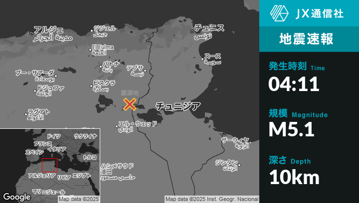 | 震源地 | チュニジアのChebikaから西47kmの地点 |