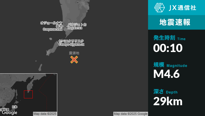 | 震源地 | ロシアのSevero-Kuril’skから南東121kmの地点 |