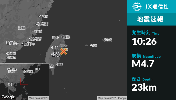 8月19日 10:26頃、台湾のHualien Cityから東15kmの地点でM4.7の地震がありました。