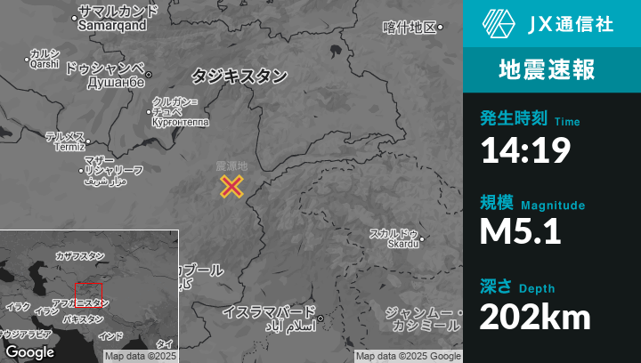 8月19日 14:19頃、アフガニスタンのJurmから南42kmの地点でM5.1の地震がありました。