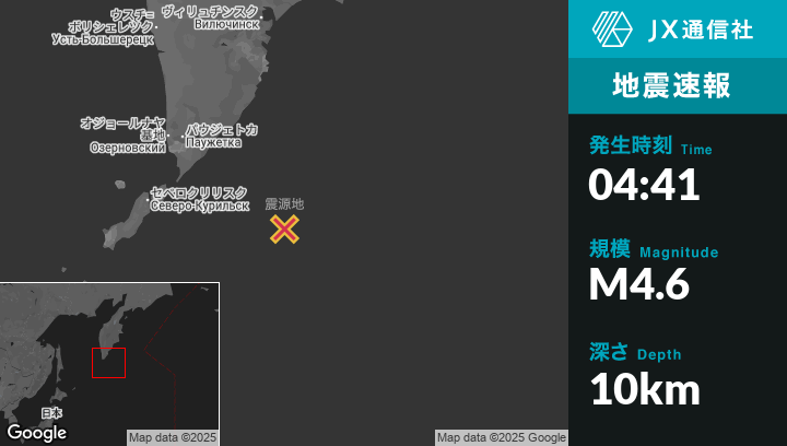 8月20日 04:41頃、ロシアのSevero-Kuril’skから東196kmの地点でM4.6の地震がありました。