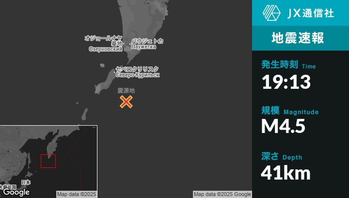 8月21日 19:13頃、ロシアのSevero-Kuril’skから南南東93kmの地点でM4.5の地震がありました。