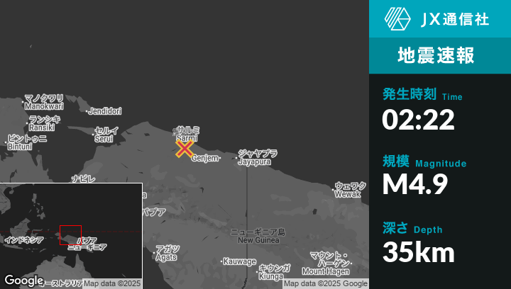8月25日 02:22頃、インドネシアのAbepuraから西北西180kmの地点でM4.9の地震がありました。