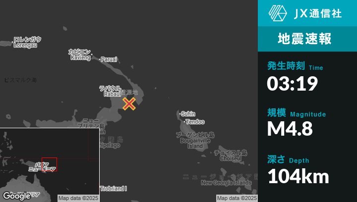 8月25日 03:19頃、パプアニューギニアのKokopoから南南東36kmの地点でM4.8の地震がありました。
