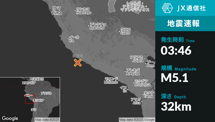 9月23日 03:46頃、ペルーのSan Juanから南南東33kmの地点でM5.1の地震がありました。