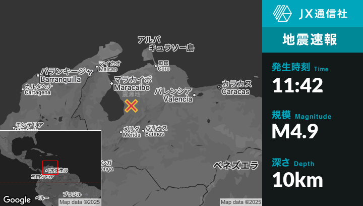 9月25日 11:42頃、ベネズエラのMene Grandeから東18kmの地点でM4.9の地震がありました。