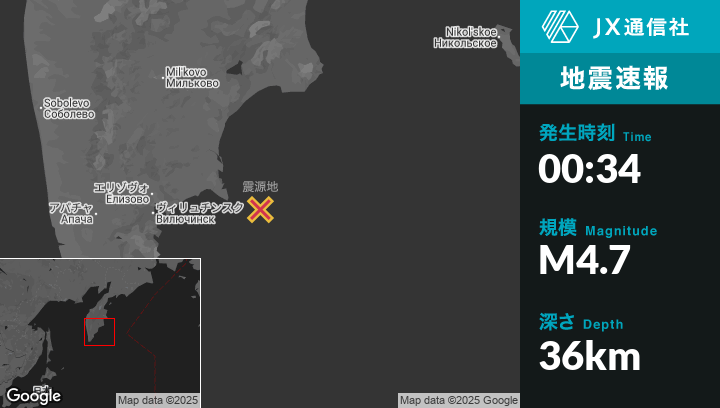 9月26日 00:34頃、ロシアのPetropavlovsk-Kamchatskyから東142kmの地点でM4.7の地震がありました。