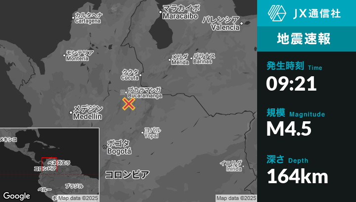 9月26日 09:21頃、コロンビアのCepitáから西4kmの地点でM4.5の地震がありました。
