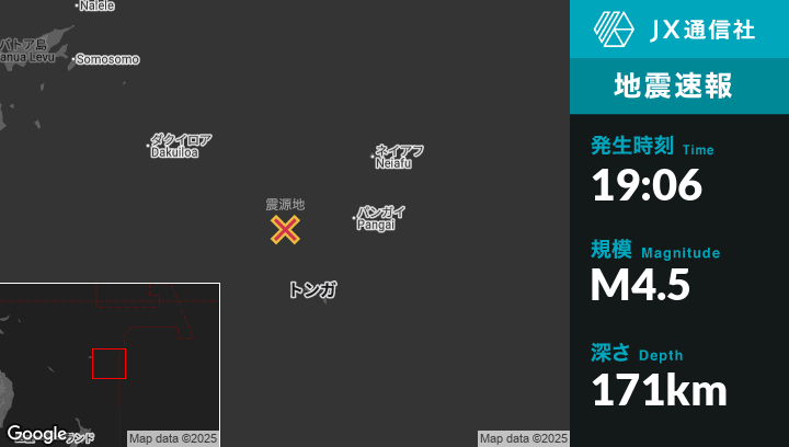 | 震源地 | トンガのPangaiから西145kmの地点 |