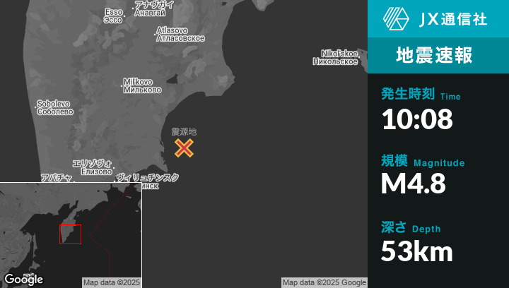 | 震源地 | ロシアのPetropavlovsk-Kamchatskyから東北東143kmの地点 |
