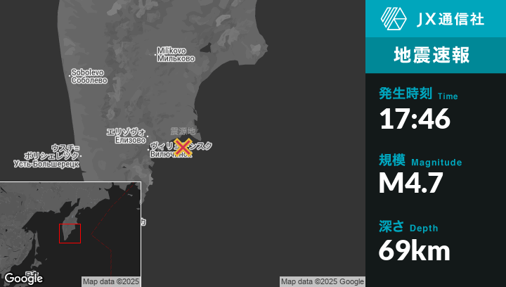 | 震源地 | ロシアのPetropavlovsk-Kamchatskyから東56kmの地点 |