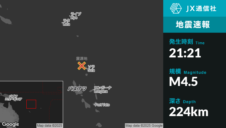 | 震源地 | バヌアツのSolaから北西54kmの地点 |