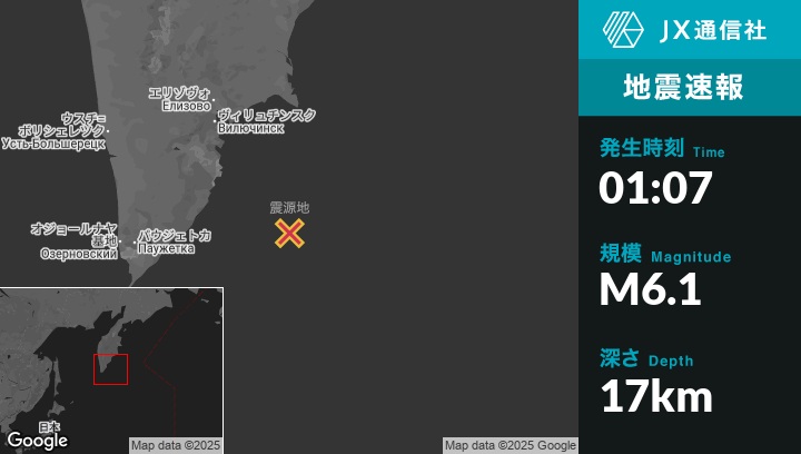 10月04日 01:07頃、ロシアのVilyuchinskから南東173kmの地点でM6.1の地震がありました。