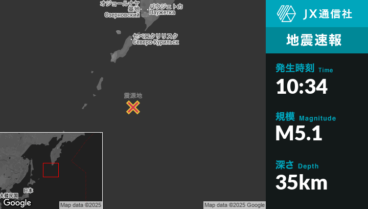 10月05日 10:34頃、ロシアのSevero-Kuril’skから南201kmの地点でM5.1の地震がありました。