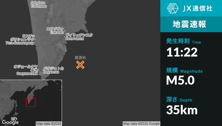 10月05日 11:22頃、ロシアのVilyuchinskから南南東146kmの地点でM5.0の地震がありました。