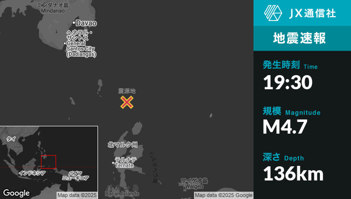 | 震源地 | インドネシアのTobeloから北210kmの地点 |