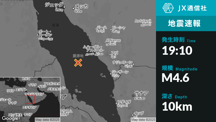 | 震源地 | サウジアラビアのAd Darbから西220kmの地点 |